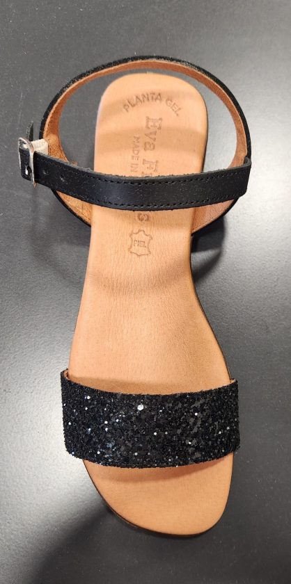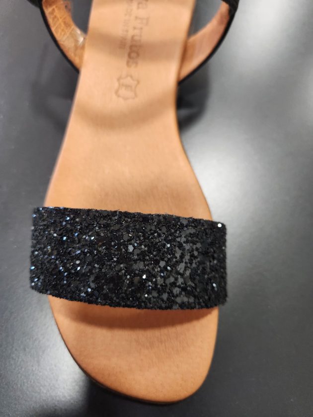Cette sandale se compose d’un cuir souple de haute qualité, assurant un chaussant agréable et une bonne tenue du pied. Une lanière pailletée à l’avant vient capter la lumière et sublimer la silhouette, apportant une touche d’éclat discrète mais élégante.