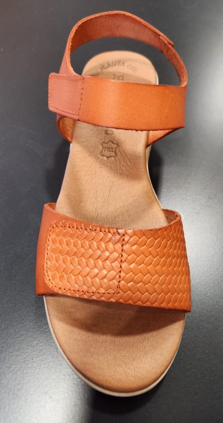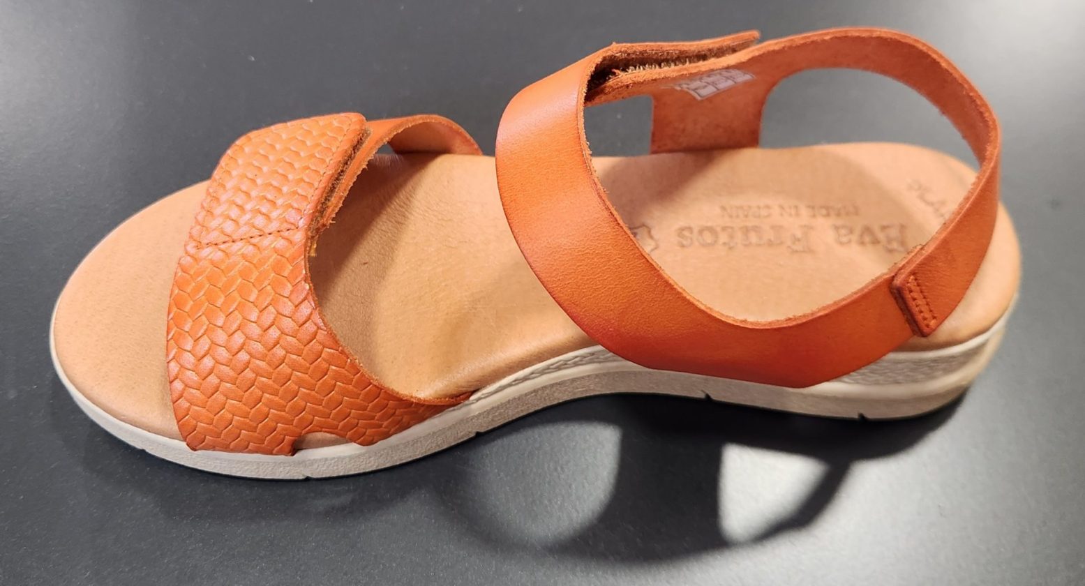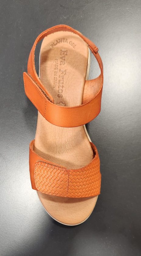 Sandale en cuir orange Eva Frutos. Chaque bride se ferme par un velcro. Faible cambrure. Modèle compensé léger et très confortable grâce à sa semelle en cuir à mémoire de forme.