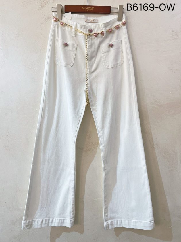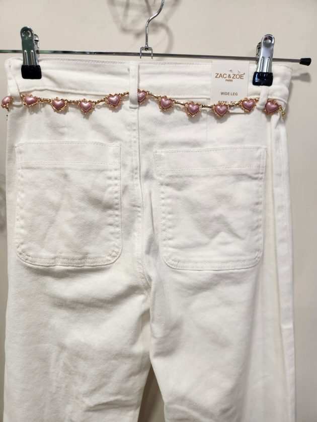 Jean blanc à la coupe large, élégant et facile à porter au quotidien. Sa taille haute met en valeur la silhouette tout en assurant un bon confort. Il se distingue par ses détails originaux : de petits boutons en forme de cœur rose sur les poches et une fine chaîne dorée à la taille ornée de cœurs, qui apporte une touche féminine et tendance.